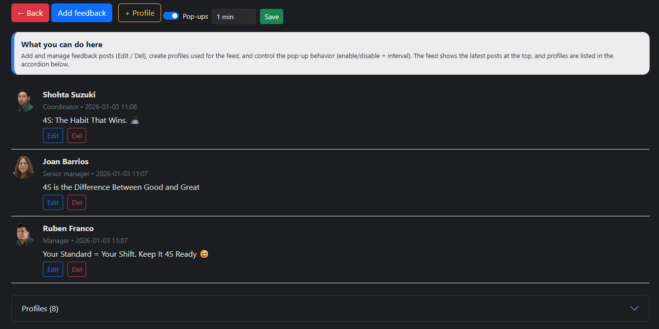 The Manage Feedback page is used to create management profiles and post shoutouts for your team. You can also adjust the index pop-up rotation time or disable the pop-up if needed.