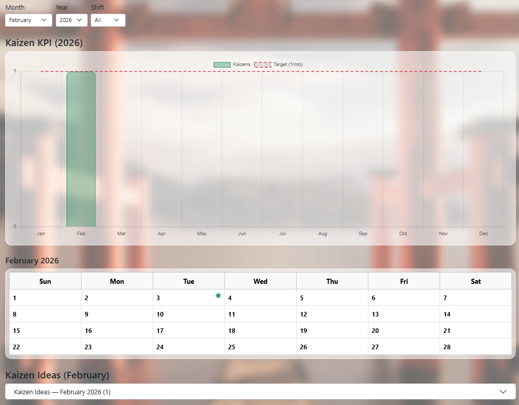 The Kaizen Calendar is used to track and display your strategy for meeting Kaizen targets set by Toyota and the 4S system.