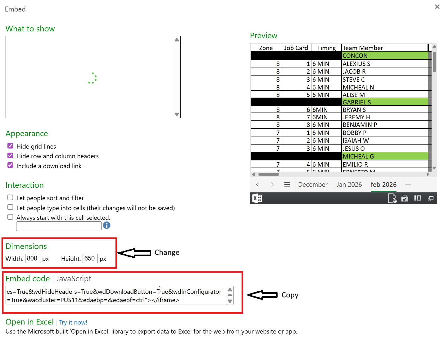 When the embed box appears, set the dimensions to 800 × 650.