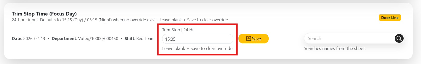 This section explains how to enter the Trim Stop Time. It is important to select the correct department number, date, and shift before entering the time.